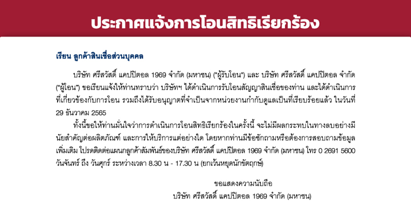 หากท่านมีข้อซักถาม หรือต้องการสอบถามข้อมูลเพิ่มเติม กรุณาติดต่อแผนกลูกค้าสัมพันธ์ บริษัท ศรีสวัสดิ์ แคปปิตอล 1969 จำกัด (มหาชน) โทร 0 2691 5600 วันจันทร์ ถึง วันศุกร์ ระหว่างเวลา 8.30 – 17.30 น. (ยกเว้นหยุดนักขัตฤกษ์)